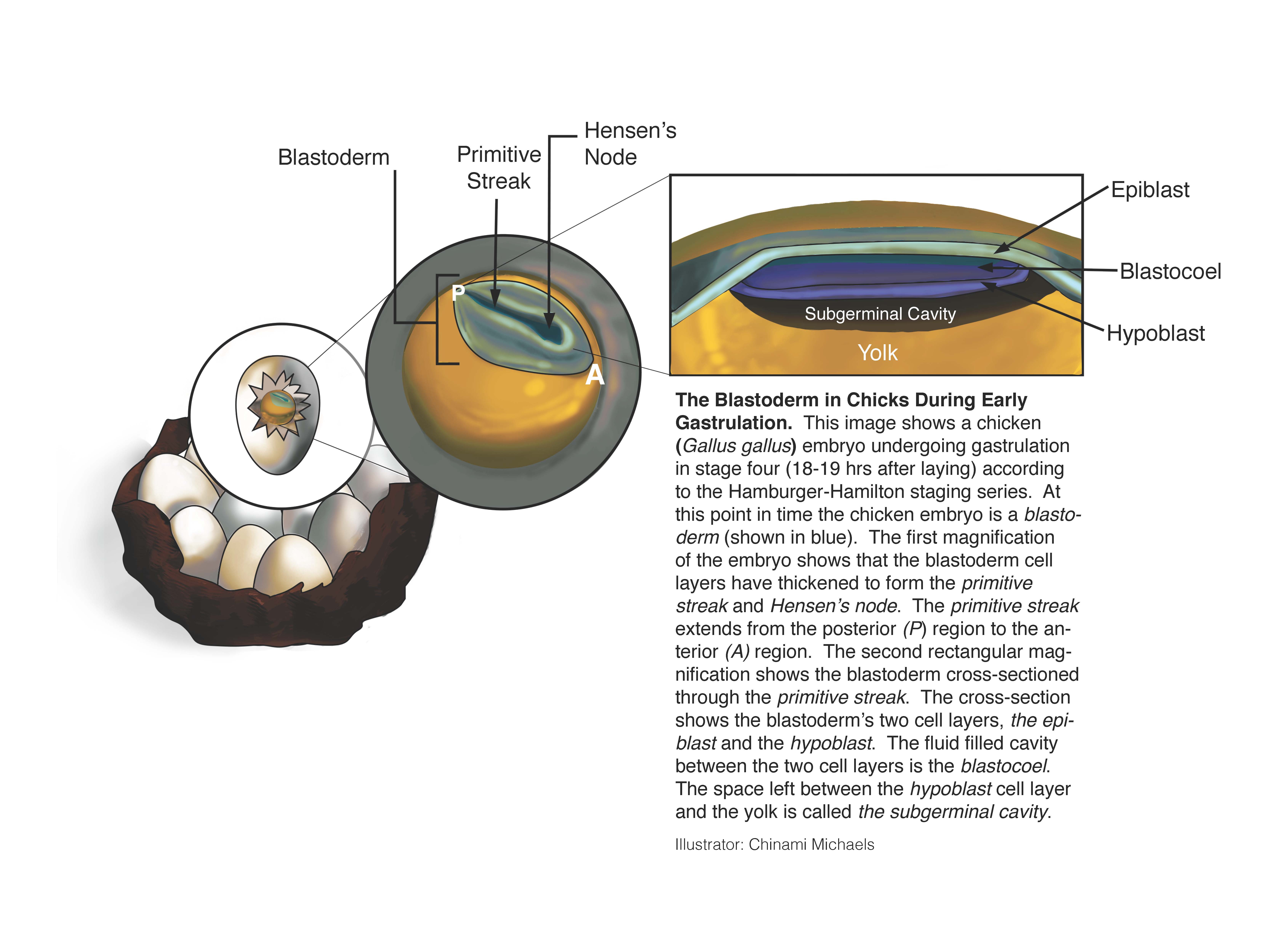 This image shows a chicken (Gallus gallus) embryo undergoing gastrulation in stage four (18-19 hrs after laying) according to the Hamburger-Hamilton staging series. At this point in time the chicken embryo is a blastoderm (shown in blue). The first magnification of the embryo shows that the blastoderm cell layers have thickened to form the primitive streak and Hensen's node. The primitive streak extends from the posterior (P) region to the anterior (A) region. The second rectangular magnification shows the blastoderm cross-sectioned through the primitive streak. The cross-section shows the blastoderm's two cell layers, the epiblast and the hypoblast. The fluid filled cavity between the two cell layers is the blastocoel. The space left between the hypoblast cell layer and the yolk is called the subgerminal cavity.
